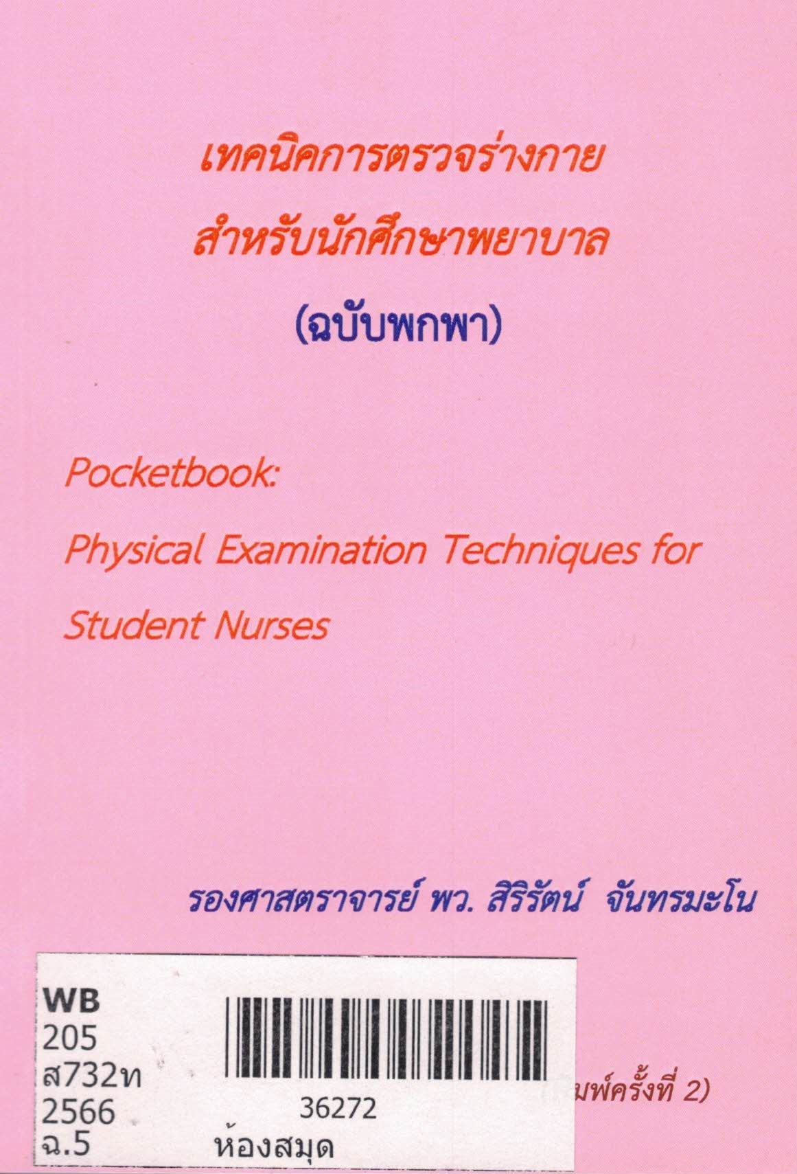 เทคนิคการตรวจร่างกายสำหรับนักศึกษาพยาบาล (ฉบับพกพา) = Pocketbook : physical examination techniques for student nurses | | พิมพ์ลักษณ์ |